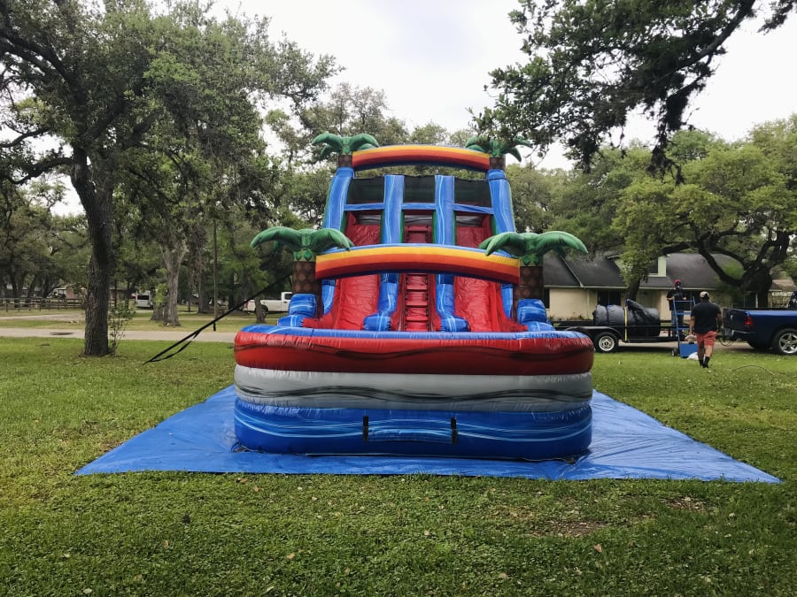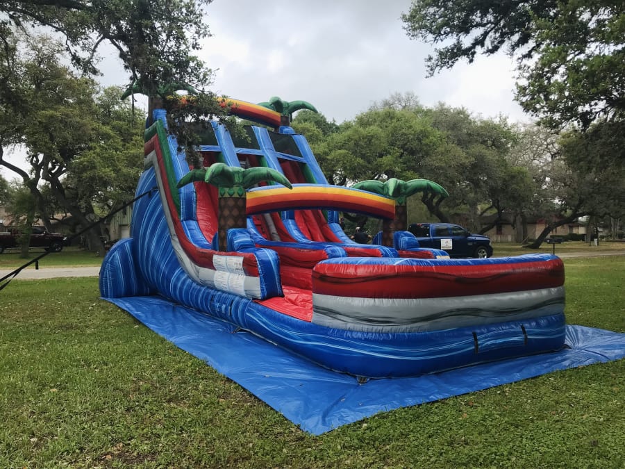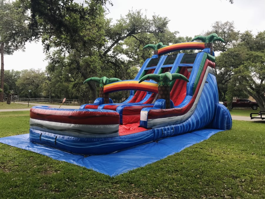 Our 20ft waterslide will be the talk of your party! It’s beautiful colors, palm trees and rainbows make it a tropical theme perfect for any summer occasion! Did we mention it has two lanes for double the fun! Blast up through the center then race down either sides and splash into the large pool!