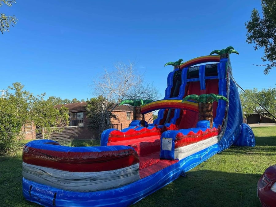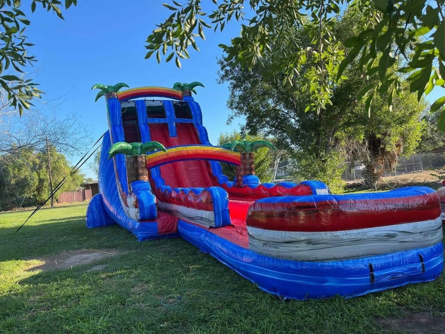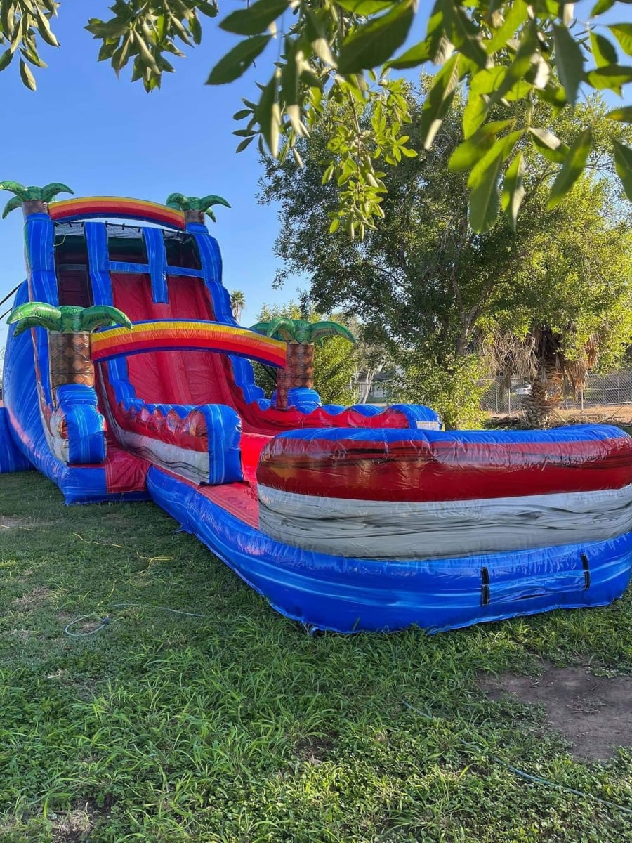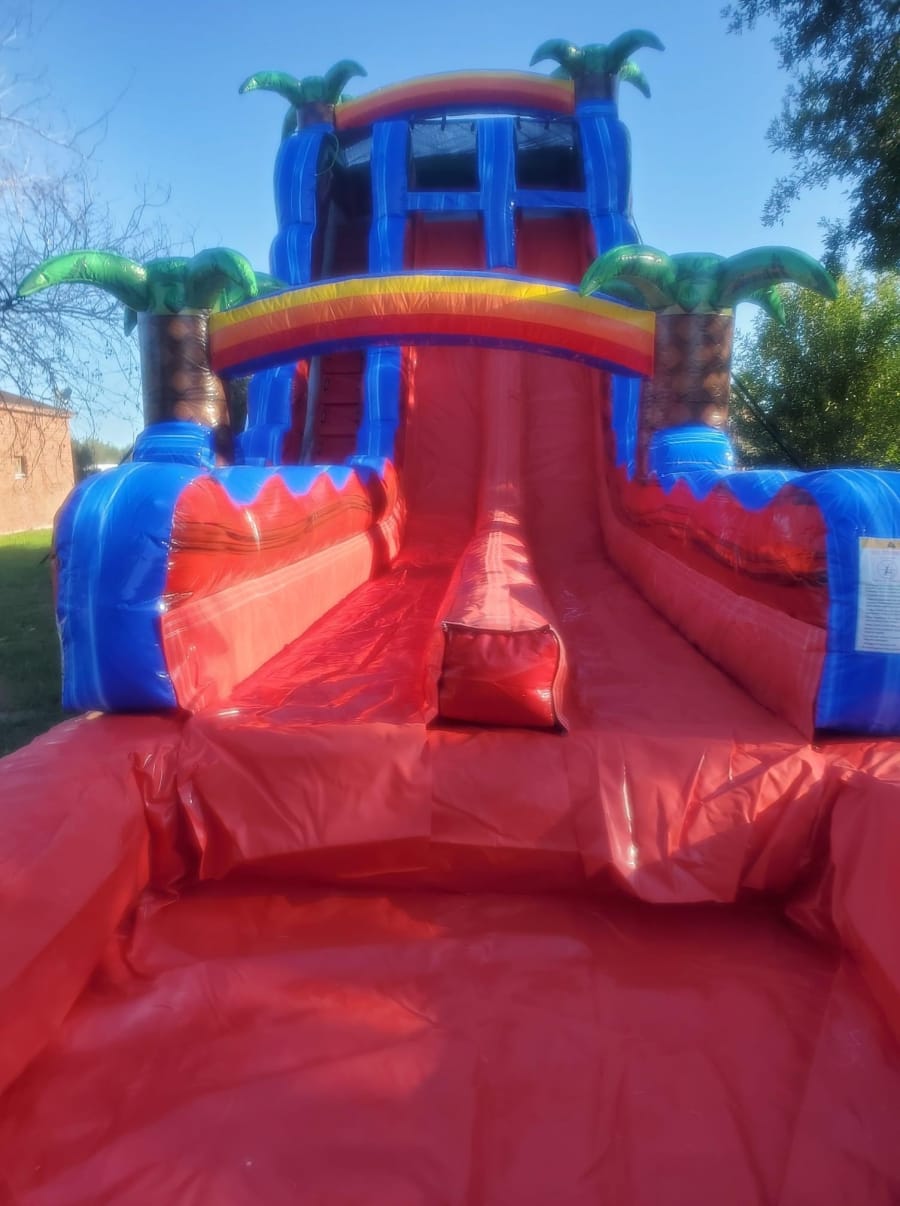 Our waterslide stands at 23ft tall! Yes you read that right 23ft tall! Did we mention it has two lanes for double the fun! Oh and our waterslide isn’t any ordinary waterslide, it has the best of both worlds! It’s a combined waterslide and slip-n-slide! Meet our 23ft Baja Blast Hybrid!
